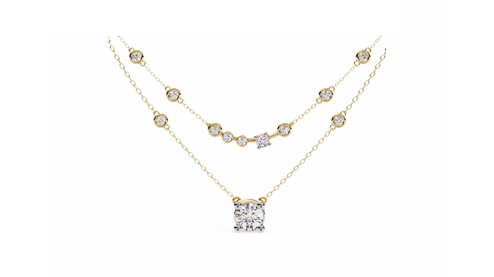 This refined layered necklace is a celebration of balance, brilliance, and modern elegance. Crafted in lustrous gold, the design features two delicately draped chains adorned with bezel-set diamonds and a striking solitaire centerpiece. The layered silhouette creates natural movement and depth, catching light beautifully with every turn.
